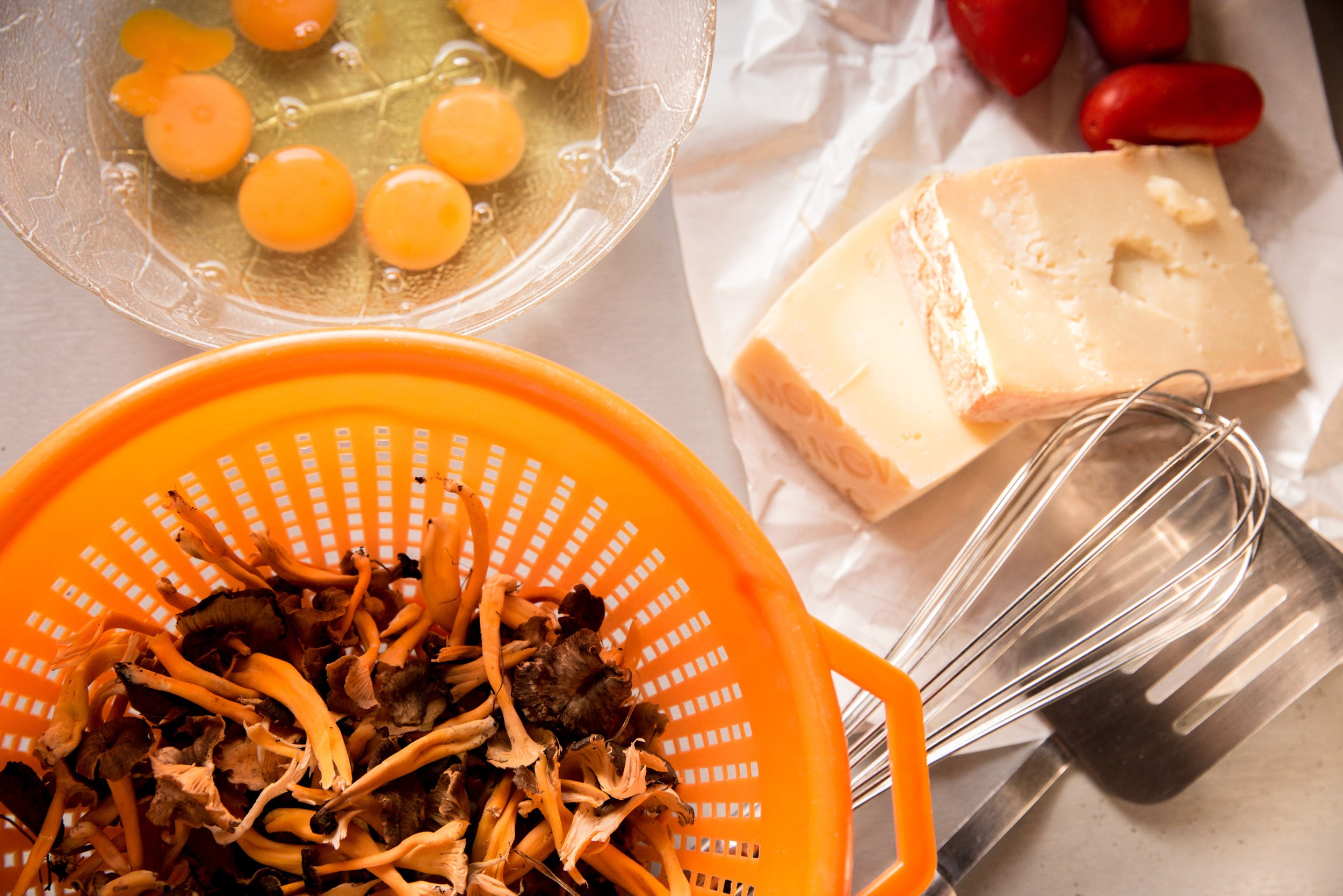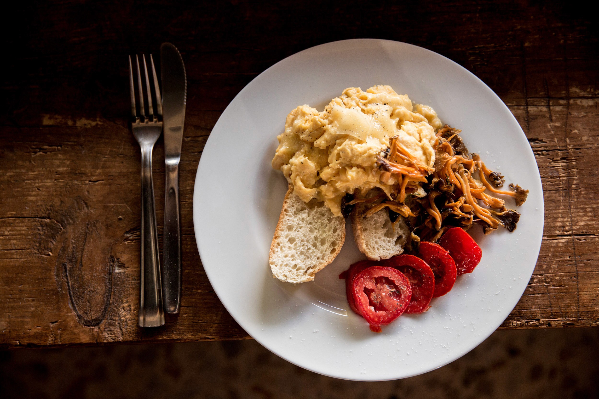 Eggs, tomato, cheese, mushrooms, bread